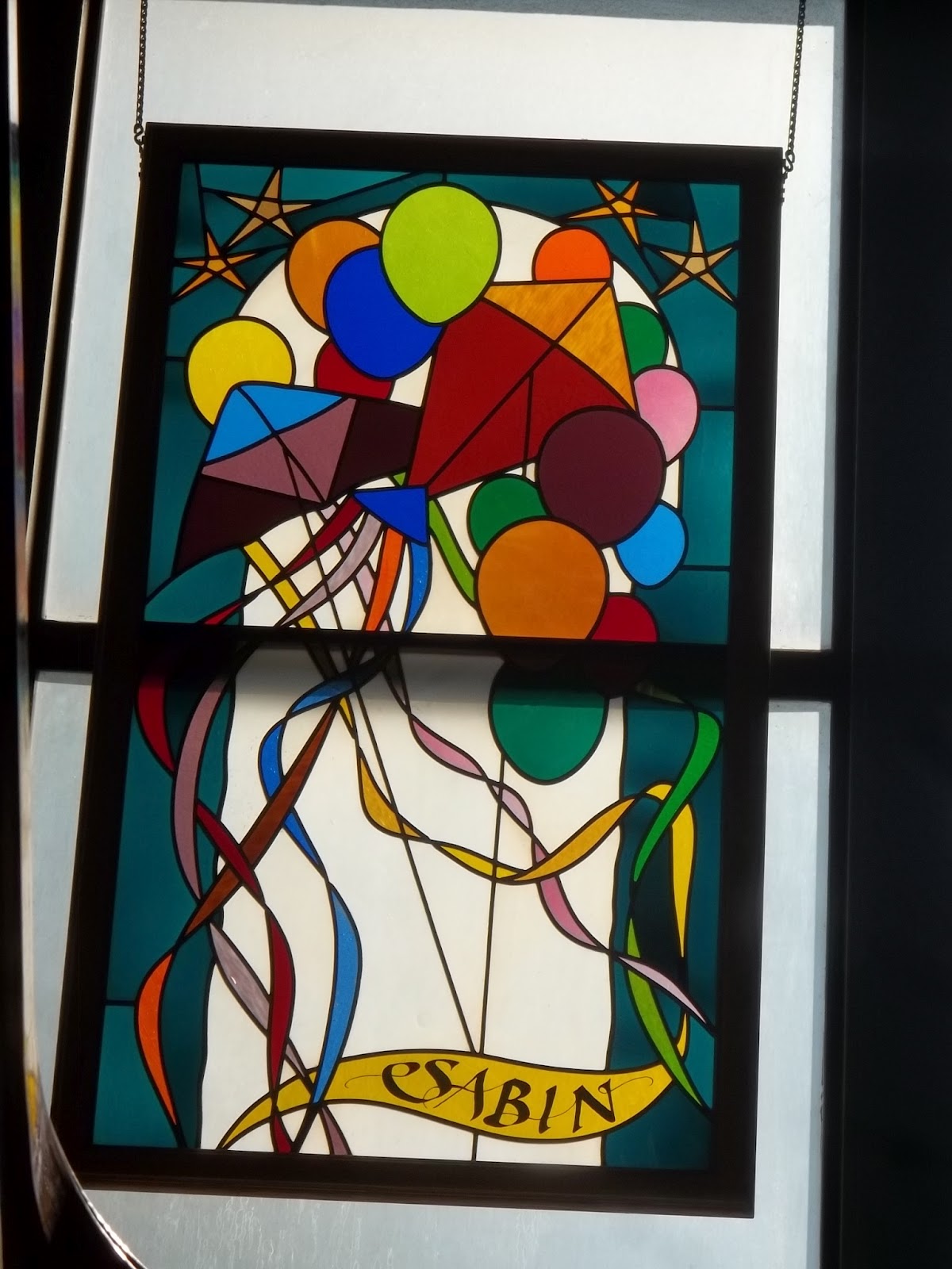 This kite and balloon logo was designed by Tinker Hatfield back when Rylan, Joylynn, Cherise, Alyssa and Krystle were students there. It was printed on colorful t-shirts with just black or white ink. I don't know who commissioned it to be done in stained glass but this gorgeous work is hung between the second and third floors above the main entrance to the school.