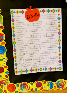 I don't know if he was waving or raising his hand but he's one of the big kids now up on the top floor of the school. I noticed this letter on Genevieve's teacher's bulletin board that he wrote to one of the incoming 1st graders.