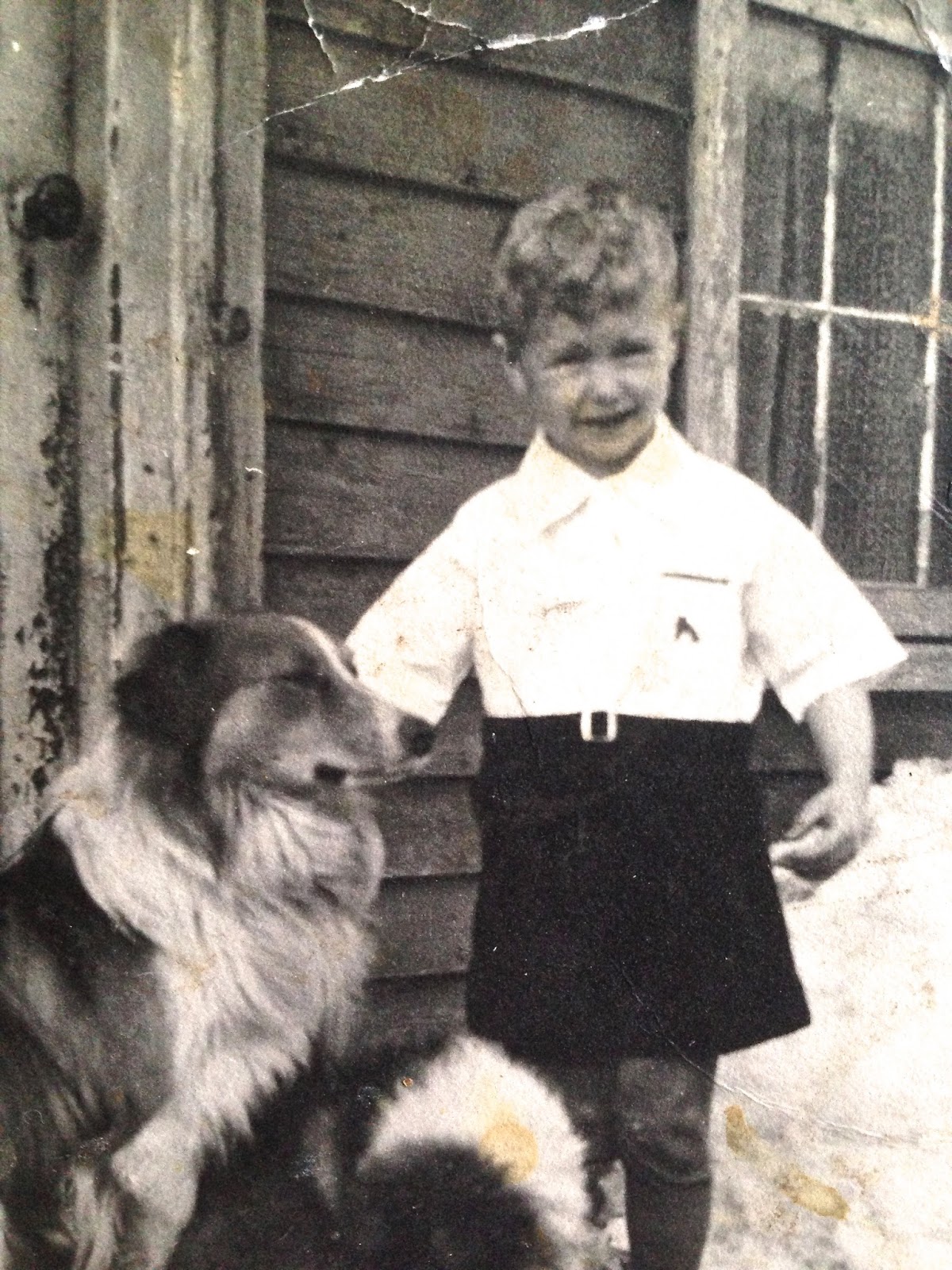 Here is a picture of my dad when he was a boy. I figure he's about 4 years old in this. If I've heard right, he got his long curly hair cut for the first time when he was three so this is after that. What a cute little guy! Those dogs are pretty handsome as well.